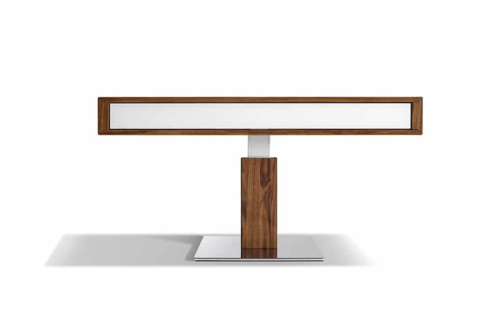 Die quadratische Tischplatte gibt es in reinem Naturholz, mit einer aufgelegten Farbglasplatte oder einer Keramikplatte. Der verchromte Mittelfuß in matt oder glänzend sorgt für Stabilität und optische Leichtigkeit.