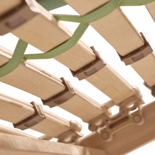 • Alle Verstellmöglichkeiten erfolgen über eine metallfreie Holzrasterung. Die Leistenauflage aus echtem Kork schont den Bezug der Matratze und verhindert, dass sie rutscht